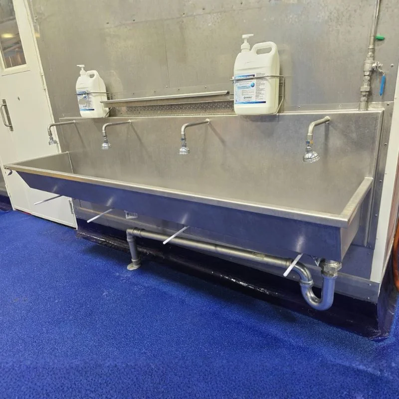 Custom fabrication of stainless equipment including working tables, sinks, sterilisers, boot washes, hose reels, chutes, hooks, and specialised processing components tailored to site requirements.